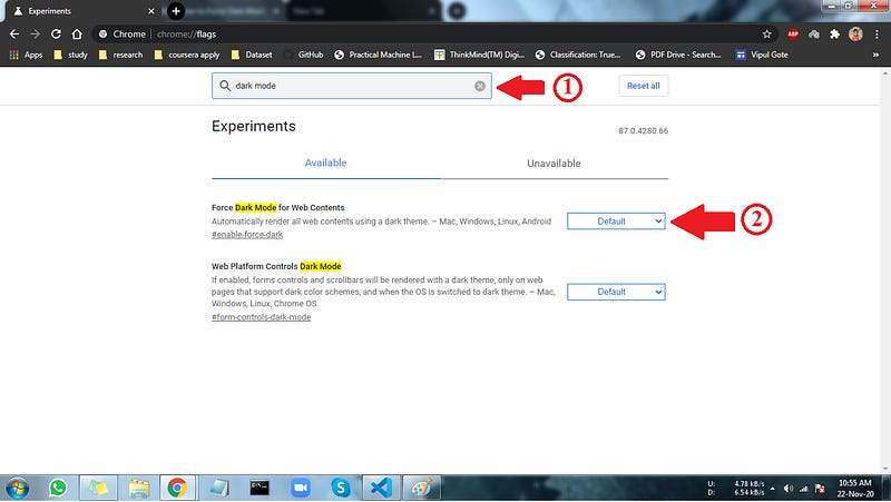 Search for “Dark Mode” in the search box at the top of the Experiments page that appears.